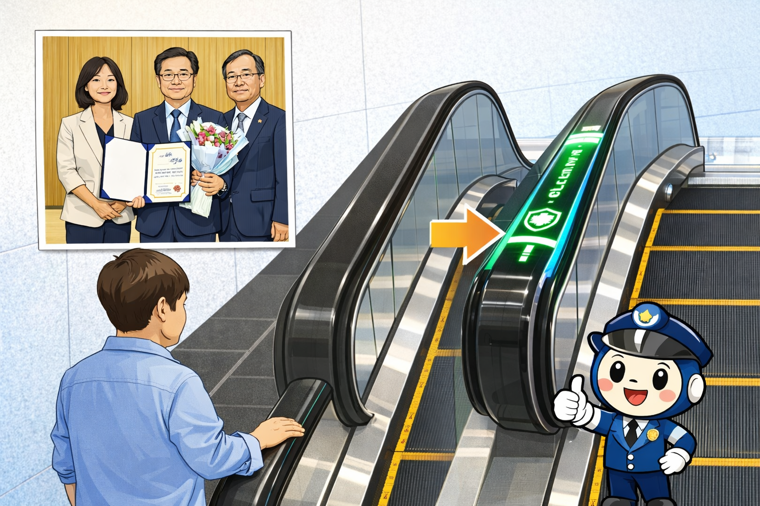 대전교통공사는 에스컬레이터 손잡이의 살균 상태를 눈으로 보여주는 아이디어로 시민 불안을 줄이고 안전까지 챙기며 적극행정 우수사례 장려상을 받았습니다.