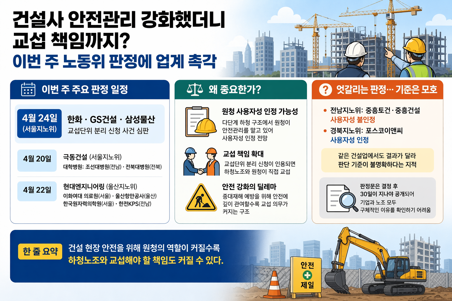건설사들이 현장 안전관리에 적극적으로 나설수록 하청노조와 직접 교섭해야 할 책임까지 커질 수 있는지, 이번 주 노동위 판정이 중요한 기준점이 될 전망입니다.