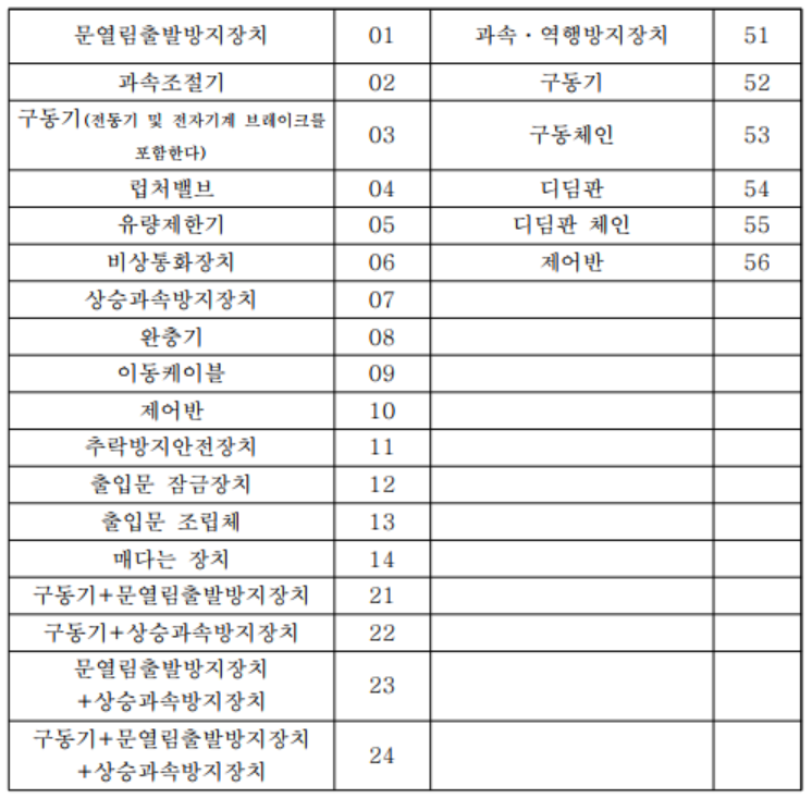③ 분류별 구분코드: 장치의 종류를 식별하는 2자리 숫자입니다. 예를 들어 과속조절기는 02, 제어반은 10, 전기식 엘리베이터는 71로 분류됩니다.