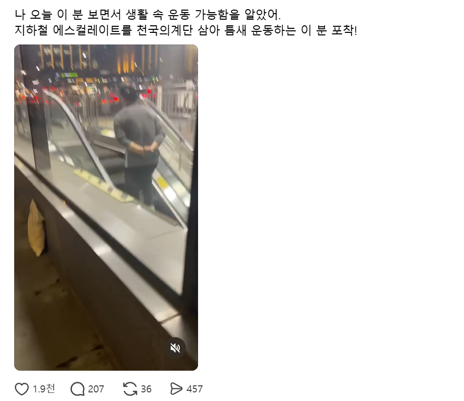 최근 SNS에는 서울 강서구 마곡나루역으로 추정되는 장소에서 촬영된 짧은 영상이 올라왔다. 영상에는 중년으로 보이는 한 남성이 아래로 내려가는 에스컬레이터 위에서 이동 방향과 반대로 걸어 올라가는 장면이 담겼다. 남성은 두 손을 뒤로 깍지 낀 채 천천히 걸으며 마치 제자리 운동을 하는 듯한 모습을 보였다.
