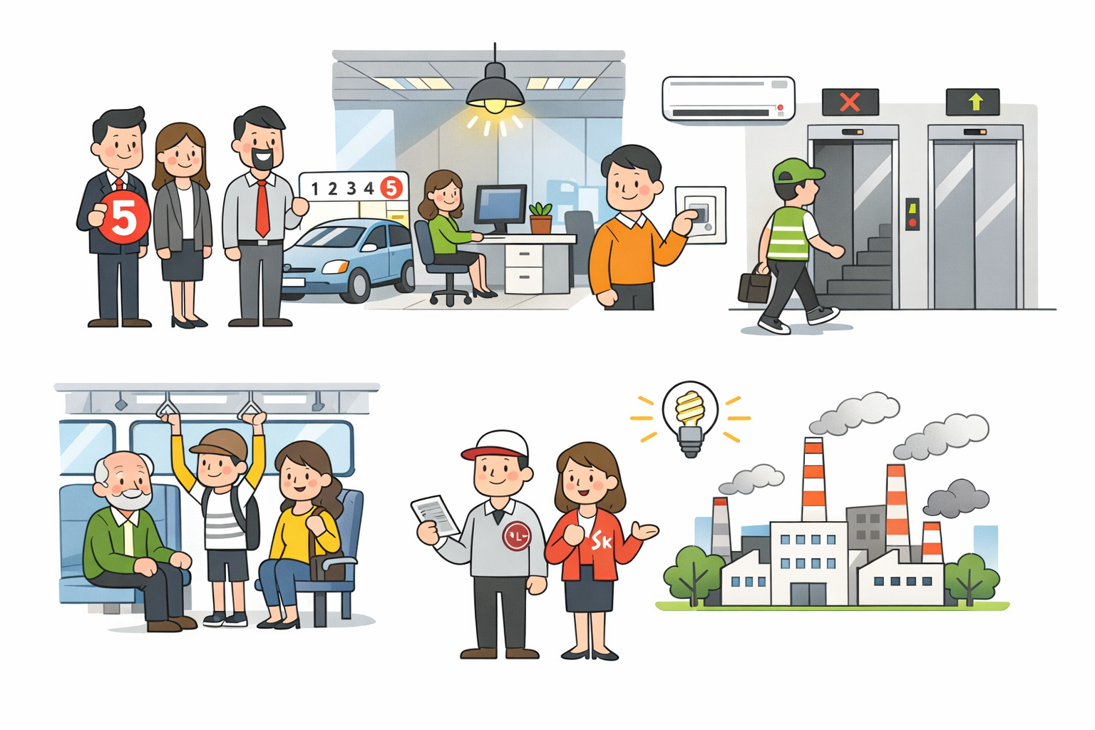 SK그룹도 차량 5부제에 참여하고, 냉난방 기준을 강화하기로 했다. 여름철 냉방은 26도 이상, 겨울철 난방은 18도 이하로 유지하는 한편, 엘리베이터는 일부 층만 정차하도록 운영하거나 저층 이용을 제한하는 방식도 검토 중이다.