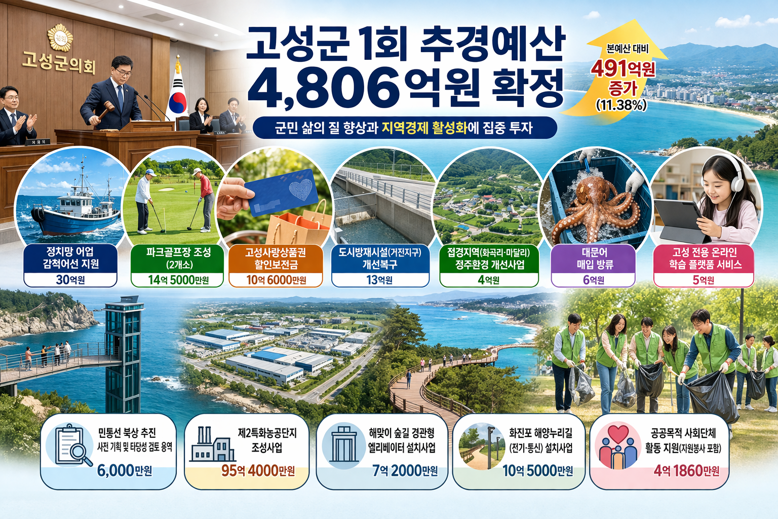 고성군은 추경 4806억원을 확정하면서 주민 체감 사업과 관광·산업 인프라 확대에 본격적으로 힘을 싣게 됐습니다.