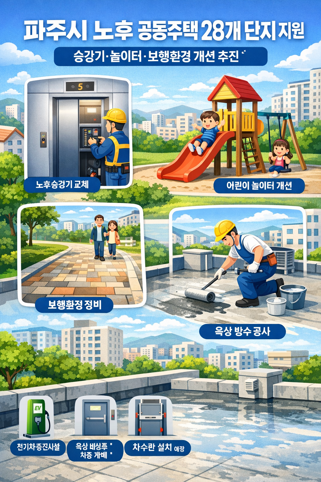 파주시는 노후 공동주택 28개 단지를 지원 대상으로 확정하고 승강기, 놀이터, 보행환경, 옥상 방수 등 생활 밀착형 정비에 나섭니다.