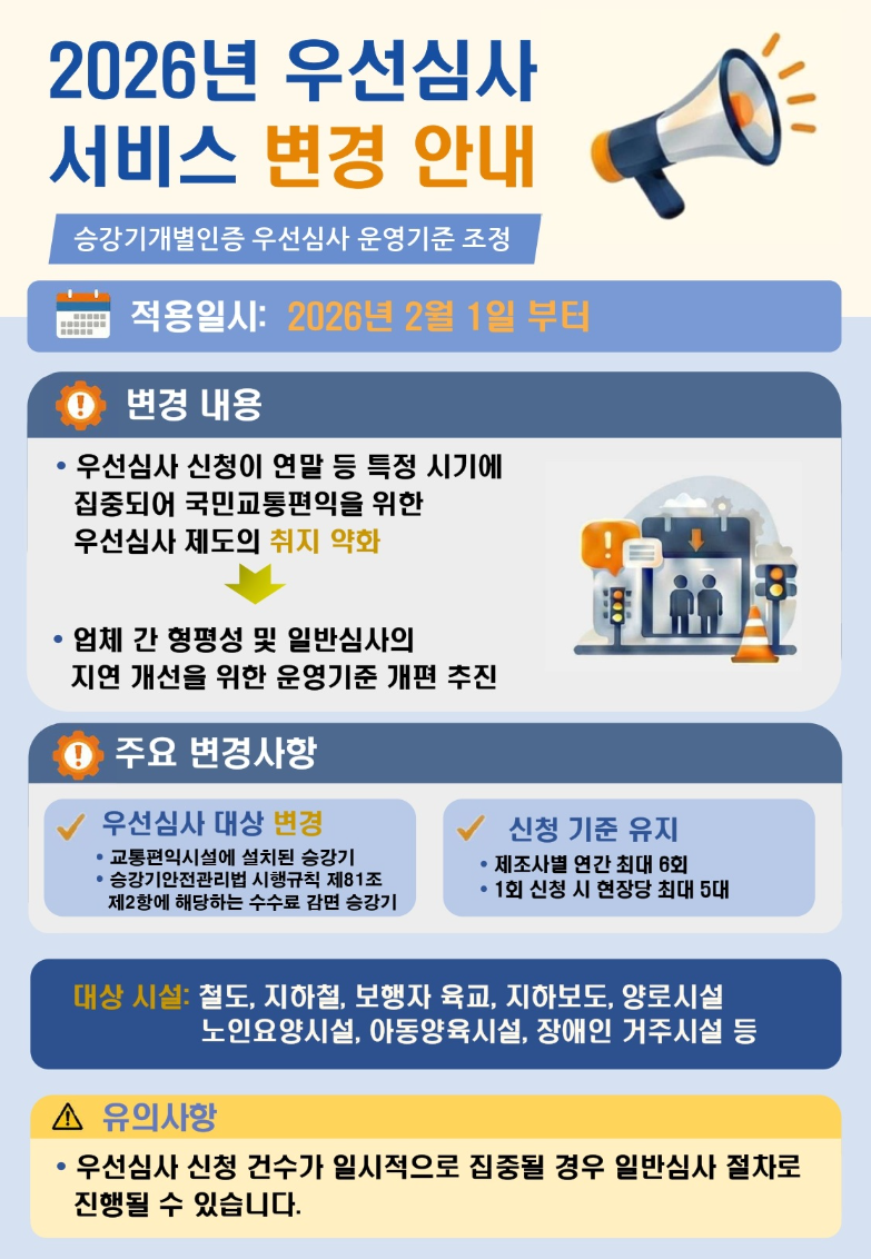 2026년 우선심사 서비스 변경 안내(승강기개별인증 우선심사 운영기준 조정)