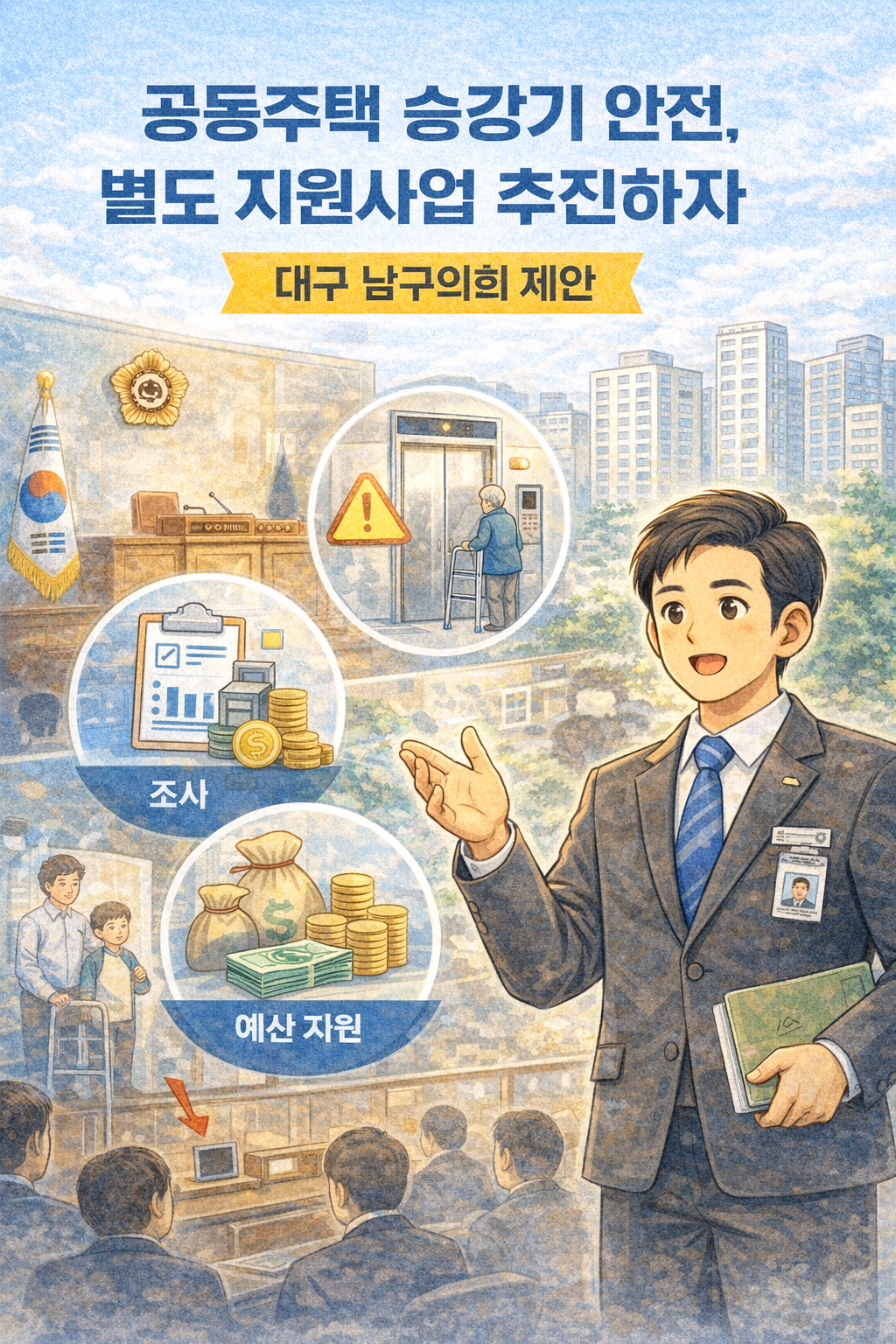 대구 남구의회에서 공동주택 승강기 안전 문제를 더 체계적으로 다뤄야 한다는 제안이 나왔습니다. 지금처럼 공동주택관리 지원사업 안에 일부 포함하는 수준이 아니라, 아예 독립적인 ‘승강기 안전 지원사업’을 따로 만들어야 한다는 겁니다.